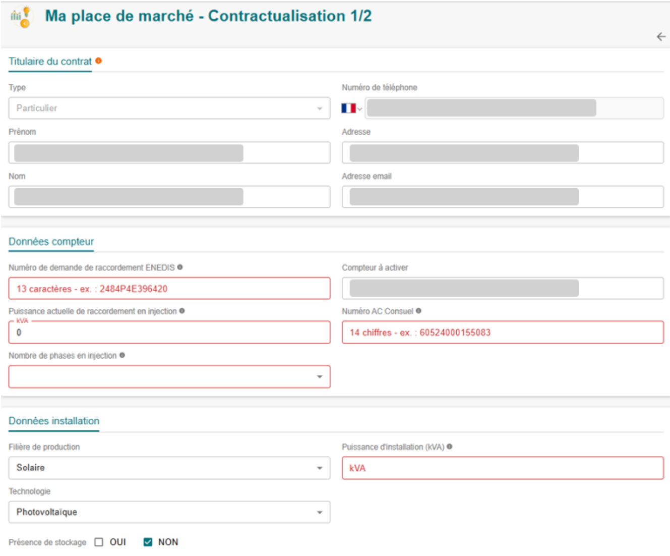 - Renseignez : numéro de demande de raccordement Enedis, numéro d’attestation de conformité Consuel, puissance de raccordement, type de phase (mono ou tri), puissance d’installation