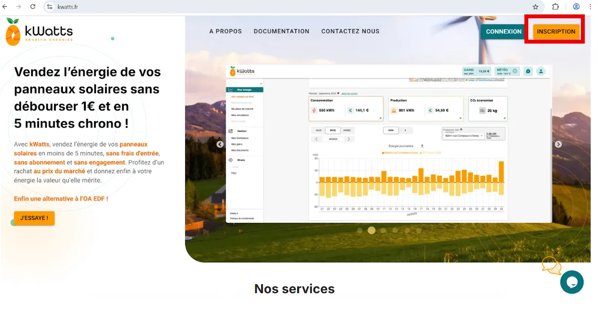 - Rendez-vous sur kwatts.fr et cliquez sur Inscription en haut à droite.