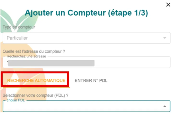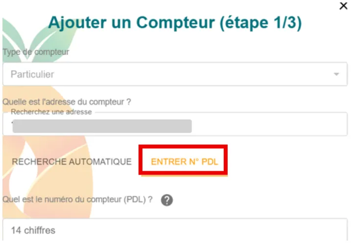 - Si votre compteur n’apparaît pas : cliquez sur Entrer n° PDL et saisissez à nouveau l’adresse et votre numéro PDL (figure sur votre facture d’électricité).