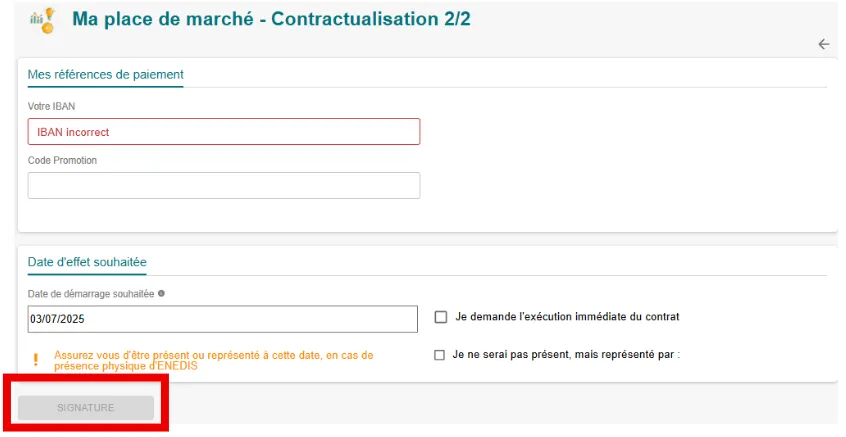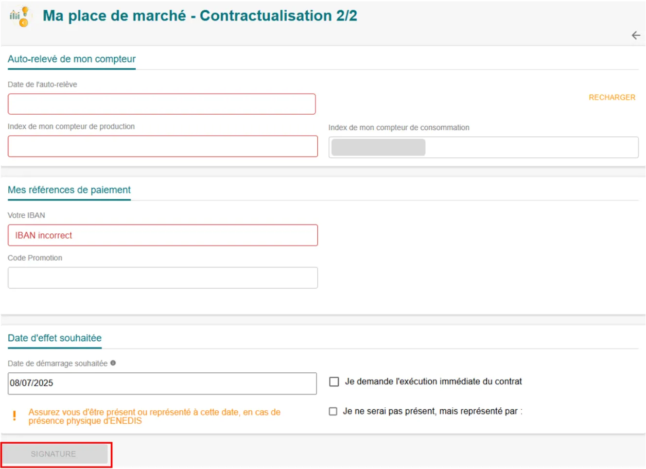 - Vérifiez vos index de production et de consommation, complétez vos informations de paiement et signez.