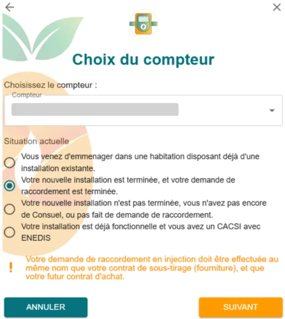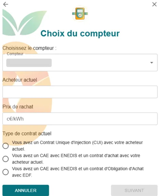 - Sélectionnez votre compteur, indiquez que vous ne valorisez pas encore votre production, puis cliquez sur Suivant.