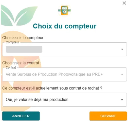 - Sélectionnez votre compteur, indiquez que vous valorisez déjà votre production, puis Suivant.